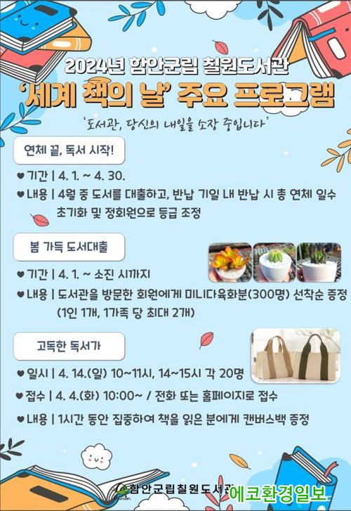 ¼¼°è Ã¥ÀÇ ³¯À» ¸ÂÀÌÇØ ´ëÃâÇÑ Ã¥À» ±â°£ ³» ¹Ý³³ÇÑ »ç¶÷ÀÇ ¿¬Ã¼Àϼö¸¦ ÃʱâÈÇÏ´Â ¡®¿¬Ã¼ ³¡, µ¶¼ ½ÃÀÛ¡¯ ÁÖ¾îÁø 1½Ã°£ µ¿¾È Ã¥À» ÀÐÀº »ç¶÷¿¡°Ô ĵ¹ö½º¹éÀ» ÁÖ´Â ¡®°íµ¶ÇÑ µ¶¼°¡¡¯ µµ¼ ´ëÃâÀÚ ¼±Âø¼ø 300¸í¿¡°Ô ¹Ì´Ï ´ÙÀ°ÈºÐÀ» ÁÖ´Â ¡®º½ °¡µæ µµ¼ ´ëÃ⡯ µî ´Ùä·Î¿î Çà»ç¸¦ ¿î¿µÇÒ ¿¹Á¤ÀÌ´Ù.
