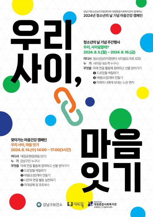 5ÀϺÎÅÍ 16ÀϱîÁö »çÀ̽°(µµ°î·Î 420)¿¡¼´Â ´Ù¾çÇÑ Ã¼ÇèÇà»ç¸¦ »ó½Ã ¿î¿µÇÑ´Ù. ¡ã¿¬°áÀ» ÁÖÁ¦·Î ÇÑ µå·ÎÀ× ¿ù(Drawing Wall) °øµ¿ ÀÛ¾÷ ¡ã¹Ì·¡ÀÇ ³ª¿¡°Ô ÀÀ¿øÀÇ ¸Þ½ÃÁö¸¦ º¸³»´Â ¡®´À¸° ÆíÁö º¸³»±â¡¯ ¡ã¿¬°áÀÇ ¼Ò¸ÁÀ» ´ãÀº ¡®¹Ù¶÷(¼Ò¸Á)°³ºñ ¸¸µé±â¡¯ µîÀ» ÁøÇàÇÑ´Ù. ´Ù¾çÇÑ Ã¼ÇèȰµ¿À» ÅëÇØ ÀÚ½ÅÀÇ ¸¶À½ »óŸ¦ ¾Ë¾ÆÂ÷¸®°í, ±×¸®±â¿Í ¸¸µé±â·Î ÅëÇØ ÀÚ¿¬½º·´°Ô °¨Á¤À» ¼ÒÅëÇÏ´Â ±âȸ¸¦ °¡Áú °ÍÀ¸·Î ±â´ëÇÑ´Ù.