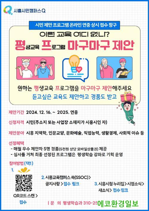 [¿¡ÄÚȯ°æÀϺ¸ ½ÃÈï½Ã=À̽ŵ¿±âÀÚ] ½ÃÈï½Ã´Â ½Ã¹ÎÀÇ ´Ù¾çÇÑ ¿ä±¸¸¦ ¹Ý¿µÇÑ ¸ÂÃãÇü Æò»ýÇнÀ ÇÁ·Î±×·¥À» ±âȹÇϰíÀÚ ¡®Æò»ýÇнÀ ÇÁ·Î±×·¥ ¸¶±¸¸¶±¸ Á¦¾È¡¯ ¿Â¶óÀÎ »ó½Ã Á¢¼ö ⱸ¸¦ ¿î¿µÇϸç, À̸¦ ÅëÇØ ¼±Á¤µÈ ½Ã¹Î Á¦¾È ÇÁ·Î±×·¥À» 2025³â ¿¬Áß ¿î¿µÇÒ °èȹÀÌ´Ù.
