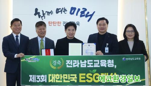 [¿¡ÄÚȯ°æÀϺ¸ Àü³²=À̽ŵ¿±âÀÚ] Àü¶ó³²µµ±³À°Ã»ÀÌ 17ÀÏ ¼¿ï ¼ºµ¿±¤Áø±³À°Áö¿øÃ»¿¡¼ ¿¸° ¾Æ¸§´Ù¿îÇб³¿îµ¿º»ºÎ ÁÖ°ü ¡®Á¦3ȸ ´ëÇѹα¹ ESG ´ë»ó ½Ã»ó½Ä¡¯¿¡¼ ESG È®»ê °ø·Î¸¦ Å©°Ô ÀÎÁ¤¹Þ¾Æ ´ë»óÀΠȯ°æºÎÀå°ü»óÀ» ¼ö»óÇß´Ù. À̳¯ ½Ã»ó½Ä¿¡¼´Â Àü³²±³À°Ã»À» ºñ·ÔÇØ ESG °æ¿µ ¹®È È®»ê¿¡ ±â¿©ÇÑ 17°³ ±â°üÀÌ »óÀ» ¹Þ¾Ò´Ù.