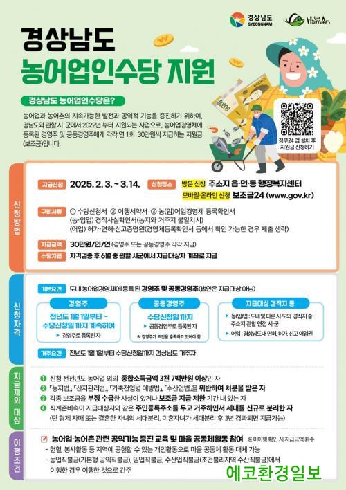 Áö±Þ ´ë»óÀÚ´Â 2024³â 1¿ù 1ÀϺÎÅÍ ¼ö´ç ½ÅûÀϱîÁö °æ»ó³²µµ¿¡ °ÅÁÖÇÏ¸é¼ ³ó¾î¾÷°æ¿µÃ¼¿¡ µî·ÏµÈ °æ¿µÁÖ¿Í °øµ¿°æ¿µÁÖÀ̸ç, °øµ¿°æ¿µÁÖ´Â ³ó¾î¾÷°æ¿µÃ¼¿¡ °æ¿µÁÖ ¿Ü ³ó¾÷ÀÎÀ¸·Î µîÀçµÈ °æ¿µÁÖÀÇ ¹è¿ìÀڷμ ¼ö´ç ½ÅûÀÏ(3¿ù 14ÀÏ)±îÁö °øµ¿°æ¿µÁÖ·Î µî·ÏÇÏ¸é µÈ´Ù.