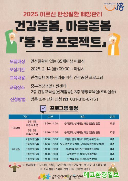 [¿¡ÄÚȯ°æÀϺ¸ ½ÃÈï½Ã=À̽ŵ¿±âÀÚ] ½ÃÈï½Ã Áߺΰǰ»ýȰÁö¿ø¼¾ÅÍ´Â 2¿ù 24ÀϺÎÅÍ 6¿ù 26ÀϱîÁö ¸¸¼ºÁúȯÀÌ ÀÖ´Â 65¼¼ ÀÌ»ó ¾î¸£½ÅÀ» ´ë»óÀ¸·Î °Ç°ÁõÁø ÇÁ·Î±×·¥ ¡®º½¤ýº½ ÇÁ·ÎÁ§Æ®¡¯¸¦ ÁøÇàÇϸç, Âü°¡ÀÚ¸¦ ¸ðÁýÇÑ´Ù.