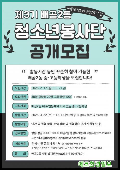 [¿¡ÄÚȯ°æÀϺ¸ ½ÃÈï½Ã=À̽ŵ¿±âÀÚ] ½ÃÈï½Ã ¹è°ð2µ¿ û¼Ò³âÁöµµÇùÀÇȸ´Â ÀÚ¿øºÀ»ç ¹× ´Ù¾çÇÑ Ã¼Çè Ȱµ¿À» ÇÔ²²ÇÒ Á¦3±â ¹è°ð2µ¿ û¼Ò³âºÀ»ç´Ü¿øÀ» 3¿ù 7ÀϱîÁö ¸ðÁýÇÑ´Ù.
