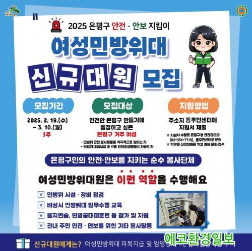 ¸ðÁý½Ã±â ±âÁØ ÀºÆò±¸ ¿©¼º¹Î¹æÀ§´ë¿øÀÇ Çö¿øÀº 82¸íÀÌ´Ù. ½Å±Ô ´ë¿øÀÇ Áö¿ø °¡´É Á¶°ÇÀº ±¸ÀÇ ¾ÈÀü‧¾Èº¸¸¦ À§ÇØ Àû±ØÀûÀ¸·Î ºÀ»çÇϰíÀÚ ÇÏ´Â ¸¶À½À» °®Ãá ÀÚ, ¹Î¹æÀ§ ´ëÇǽü³ ¹× ±¸¹ÎÀ» À§ÇÑ °¢Á¾ ¾ÈÀü¼øÂûȰµ¿ÀÌ °¡´ÉÇÑ ÀÚ·Î À§ÀÇ 2°¡Áö¸¦ ÃæÁ·ÇÏ´Â ÀºÆò±¸ °ÅÁÖ ¿©¼ºÀÌ´Ù.