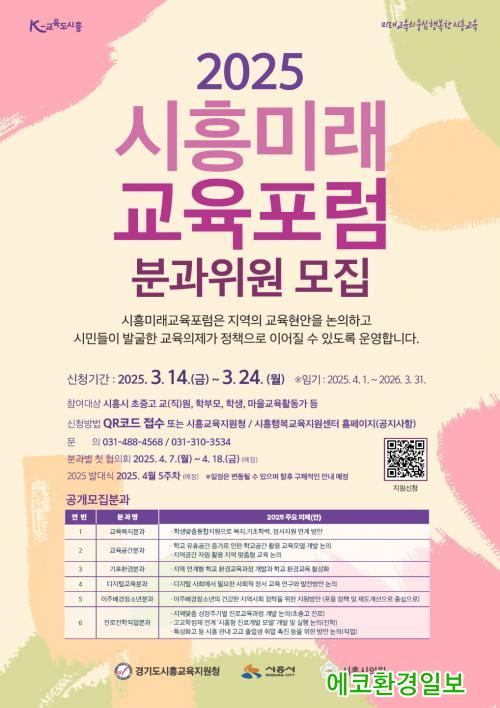 [¿¡ÄÚȯ°æÀϺ¸ ½ÃÈï½Ã=À̽ŵ¿±âÀÚ] ½ÃÈï½Ã´Â 3¿ù 14ÀϺÎÅÍ 24ÀϱîÁö ¡®2025 ½ÃÈï¹Ì·¡±³À°Æ÷·³¡¯ÀÇ ºÐ°úÀ§¿øÀ» °ø°³ ¸ðÁýÇÑ´Ù. ½ÃÈï¹Ì·¡±³À°Æ÷·³Àº ½ÃÈï½Ã¿Í °æ±âµµ½ÃÈï±³À°Áö¿øÃ», ½ÃÈï½ÃÀÇȸ°¡ ½ÃÈïÁö¿ª ±³À°°øµ¿Ã¼ °£ ¼ÒÅë°ú Çù¾÷À» ÅëÇØ ±³À°ÀÇÁ¦¸¦ ¹ß±¼Çϰí À̸¦ Á¤Ã¥À¸·Î ½ÇÇöÇϱâ À§ÇØ ¿î¿µÇÏ´Â Áö¿ª±³À°ÇùÀÇü´Ù.