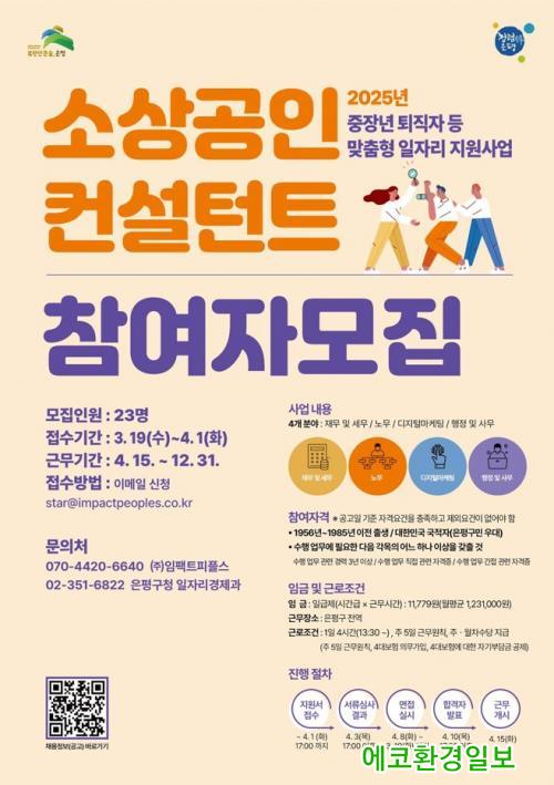 ¿ÃÇØµµ ¸ðÁý ºÐ¾ßº° 3³â ÀÌ»ó °æ·ÂÀÚ·Î ¡®¼Ò»ó°øÀÎ ÄÁ¼³ÅÏÆ®¡¯ 23¸íÀ» ¼±¹ßÇÒ ¿¹Á¤ÀÌ´Ù. ¸ðÁý ºÐ¾ß´Â À繫 ¹× ¼¼¹«ºÐ¾ß, ¸ÅÃ⡤ºñ¿ëºÐ¼®, ¼¼¹«¡¤´ëÃâ »ó´ã µî, ³ë¹« ºÐ¾ß, ±Ù·Î±âÁعý, 4´ëº¸Çè, ±Þ¿©¸í¼¼¼ ÀÛ¼º µî µðÁöÅÐ ¸¶ÄÉÆÃ ºÐ¾ß, ±¤°í, È«º¸, µðÀÚÀÎ Á¦ÀÛ, ÇàÁ¤¡¤»ç¹« ºÐ¾ß, ¸ÂÃãÇü ¼Ò»ó°øÀÎ Áö¿ø Á¤º¸ ¹× ½Åû Áö¿ø µî ÃÑ 4°³´Ù.