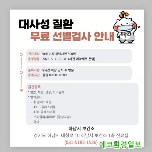 [¿¡ÄÚȯ°æÀϺ¸ Çϳ²½Ã=À̽ŵ¿±âÀÚ] Çϳ²½Ã´Â ½Ã¹ÎÀÇ °Ç°­ÇÑ »îÀ» Áö¿øÇÏ°í ´ë»çÁõÈıºÀ» ºñ·ÔÇÑ ¸¸¼ºÁúȯ ¿¹¹æ°ü¸®¸¦ °­È­Çϱâ À§ÇØ, ¿À´Â 5¿ù 1ÀϺÎÅÍ 8¿ù 31ÀϱîÁö ´ë»ç¼º Áúȯ ¹«·á ¼±º°°Ë»ç¸¦ ½Ç½ÃÇÑ´Ù°í ¹àÇû´Ù.