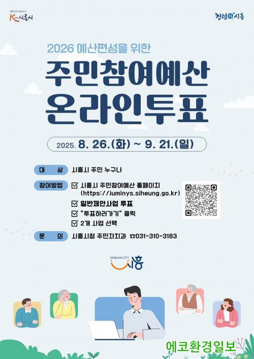[¿¡ÄÚȯ°æÀϺ¸ ½ÃÈï½Ã=À̽ŵ¿±âÀÚ] ½ÃÈï½Ã°¡ 2026³â ¿¹»êÆí¼ºÀ» À§ÇÑ ÁÖ¹ÎÂü¿©¿¹»ê ÀϹÝÁ¦¾È»ç¾÷ ¿Â¶óÀÎÅõÇ¥¸¦ 8¿ù 26ÀϺÎÅÍ 9¿ù 21ÀϱîÁö ½Ç½ÃÇÑ´Ù.