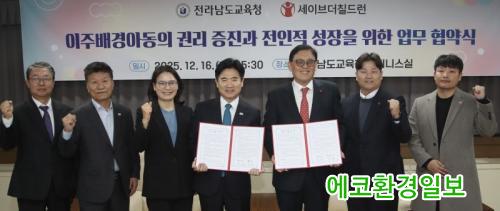 ±è´ëÁß Àü³²±³À°°¨(¿ÞÂÊ)°ú Á¤Å¿µ ¼¼À̺ê´õÄ¥µå·± ÃÑÀåÀÌ 16ÀÏ Àü³²±³À°Ã» ºñÁî´Ï½º½Ç¿¡¼­ ¡®ÀÌÁÖ¹è°æ¾Æµ¿ÀÇ ±Ç¸® º¸Àå°ú ÀüÀÎÀû ¼ºÀåÀ» À§ÇÑ ¾÷¹«Çù¾à¡¯À» ü°áÇÑ µÚ Çù¾à¼­¸¦ µé°í ±â³ä»çÁø ÃÔ¿µÀ» Çϰí ÀÖ´Ù.