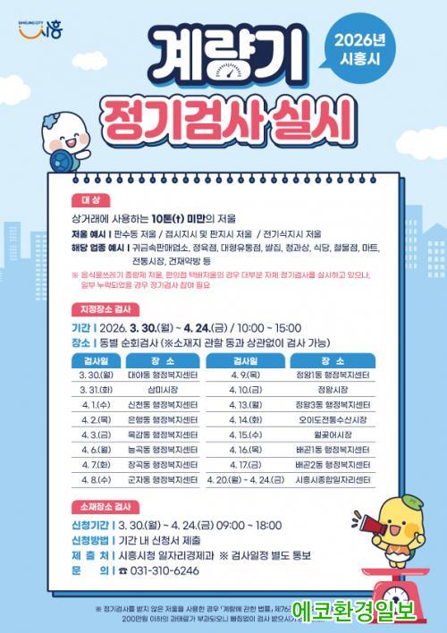 [¿¡ÄÚȯ°æÀϺ¸ ½ÃÈï½Ã=À̽ŵ¿±âÀÚ] ½ÃÈï½Ã´Â °øÁ¤ÇÑ »ó°Å·¡ Áú¼ È®¸³°ú ¼ÒºñÀÚ ±ÇÀÍ º¸È£¸¦ À§ÇØ ¿À´Â 3¿ù 30ÀϺÎÅÍ 4¿ù 24ÀϱîÁö ¡®2026³â °è·®±â(Àú¿ï) Á¤±â °Ë»ç¡¯¸¦ ½Ç½ÃÇÑ´Ù.