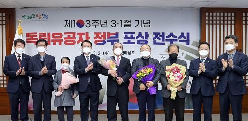 [¿¡ÄÚȯ°æÀϺ¸´º½º=Á¤ÁöÀ± ±âÀÚ] Àü¶ó³²µµ´Â 2ÀÏ µµÃ» VIP½Ç¿¡¼­ Á¦103ÁÖ³â 31ÀýÀ» ¸Â¾Æ Á¤ºÎ Æ÷»ó Àü¼ö½ÄÀ» ¿­¾î µ¶¸³¿îµ¿ÀÚ±Ý ¸ð±Ý, ¼ÒÀÛ±Ç ÀÌÀü ºÎ´çÇÔ¿¡ ´ëÇÑ ½ÃÀ§ µîÀ¸·Î Åõ¿ÁµÈ 4¸í¿¡°Ô Æ÷»óÀ» Àü´ÞÇß½À´Ï´Ù. Æ÷»óÀÚ´Â °Ç±¹Æ÷Àå °í °­ÅÂ±Ô ¼±»ý, ´ëÅë·Éǥâ °í¡¦
