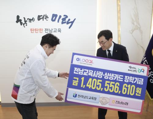 [¿¡ÄÚȯ°æÀϺ¸ Àü³²¿©¼ö=À̽ŵ¿±âÀÚ]Àü¶ó³²µµ±³À°Ã»ÀÌ 12ÀÏ(È­) NH³óÇùÀºÇà Àü³²¿µ¾÷º»ºÎ(º»ºÎÀå Á¤ÀçÇå)·ÎºÎÅÍ 14¾ï 555¸¸ ¿øÀÇ ¡®Àü³²±³À°»ç¶ûÄ«µå¡¤Áö¿ª»ó»ýÄ«µå ÀåÇбâ±Ý¡¯À» Àü´Þ¹Þ¾Ò´Ù. Àü¶ó³²µµ±³À°Ã» ºñÁî´Ï½º½Ç¿¡¼­ ¿­¸° À̳¯ Àü´Þ½Ä¿¡´Â ±è´ëÁß ±³À°°¨À» ºñ¡¦