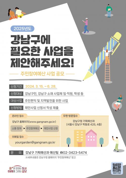 [¿¡ÄÚȯ°æÀϺ¸ °­³²=À̽ŵ¿±âÀÚ]°­³²±¸°¡ 3¿ù 15ÀϺÎÅÍ 6¿ù 28ÀϱîÁö ³»³âµµ ¿¹»êÆí¼º¿¡ ¹Ý¿µÇÒ ÁÖ¹ÎÂü¿©¿¹»ê Á¦¾È»ç¾÷ °ø¸ð¸¦ ÁøÇàÇÑ´Ù. ±¸¹Î, °ü³» »ç¾÷ü ÀÓ¡¤Á÷¿ø, Çлý µî ´©±¸³ª ÁֹΠÆíÀÍÀ» ³ôÀÌ°í °­³² ¹ßÀü¿¡ ±â¿©ÇÒ ¼ö ÀÖ´Â »ç¾÷À» Á¦¾ÈÇÒ ¼ö ÀÖ´Ù. ¿¹»ê ¡¦