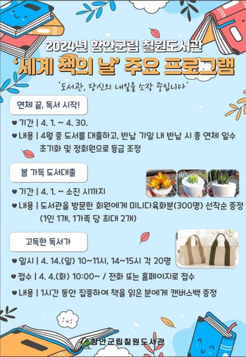 [¿¡ÄÚȯ°æÀϺ¸ °æ³²ÇÔ¾È=À̽ŵ¿±âÀÚ]ÇԾȱº¸³ Ä¥¿øµµ¼­°üÀº 4¿ù 23ÀÏ ¼¼°è Ã¥ÀÇ ³¯À» ¸ÂÀÌÇÏ¿© 4¿ù ÇÑ ´Þ µ¿¾È ´Ù¾çÇÑ À̺¥Æ®¸¦ ¿î¿µÇÑ´Ù°í ¹àÇû´Ù. ¼¼°è Ã¥ÀÇ ³¯À» ¸ÂÀÌÇØ ´ëÃâÇÑ Ã¥À» ±â°£ ³» ¹Ý³³ÇÑ »ç¶÷ÀÇ ¿¬Ã¼Àϼö¸¦ ÃʱâÈ­ÇÏ´Â ¡®¿¬Ã¼ ³¡, µ¶¼­ ½ÃÀÛ¡¯ ÁÖ¾îÁø¡¦