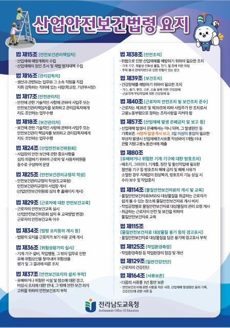 [¿¡ÄÚȯ°æÀϺ¸ Àü³²=À̽ŵ¿±âÀÚ] Àü¶ó³²µµ±³À°Ã»Àº µµ³» Çб³(±â°ü)ÀÇ »ê¾÷¾ÈÀüº¸°Ç¹ý·É Àǹ«ÀÌÇà »çÇ× Áؼö ¹× »ê¾÷ÀçÇØ ¿¹¹æÀ» À§ÇØ ¡®»ê¾÷¾ÈÀüº¸°Ç¹ý·É ¿äÁö¡¯¿Í ¡®¾ÈÀü¼öÄ¢¡¯Æ÷½ºÅ͸¦ Á¦ÀÛÇØ ¹èºÎÇß´Ù. »ê¾÷¾ÈÀüº¸°Ç¹ý·É ¿äÁö´Â »ê¾÷¾ÈÀüº¸°Ç¹ý·É¿¡ µû¶ó Çб³(±â¡¦