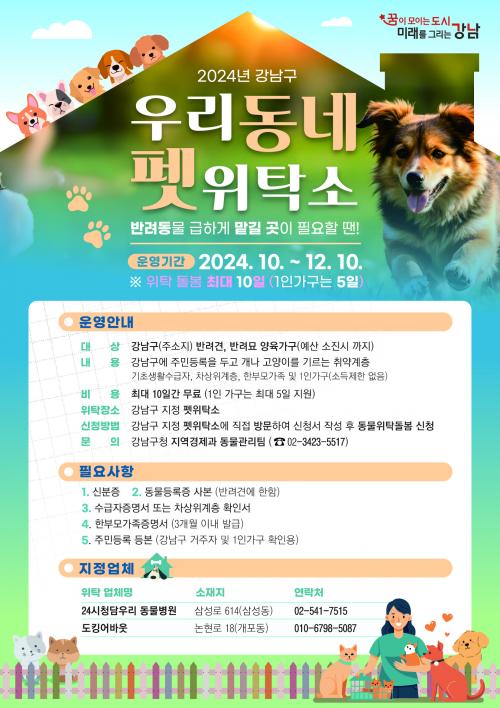 [¿¡ÄÚȯ°æÀϺ¸ °­³²±¸=À̽ŵ¿±âÀÚ] ²ÞÀÌ ¸ðÀÌ´Â µµ½Ã, ¹Ì·¡¸¦ ±×¸®´Â °­³²±¸°¡ ¿ÃÇØ ¿¬¸»±îÁö ¿ì¸® µ¿³× Æê À§Å¹¼ÒÀÇ ½ÅûÀÚ¸¦ ¸ðÁýÇÑ´Ù. ¿ÃÇØ ½Ã¹ü ¿î¿µÇÏ´Â Æê À§Å¹¼Ò´Â º´¿ø ÀÔ¿øÀ̳ª ¿©Çà µîÀ¸·Î ¹Ý·Á°ß¡¤¹Ý·Á¹¦¸¦ ±ÞÇÏ°Ô ¸Ã±æ °÷ÀÌ ÇÊ¿äÇÑ ±¸¹Î¿¡°Ô Á¦°øµÇ´Â ¹Ý·Áµ¿¡¦