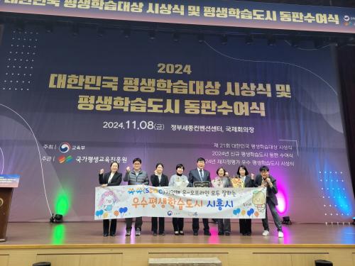 [¿¡ÄÚȯ°æÀϺ¸ ½ÃÈï½Ã=À̽ŵ¿±âÀÚ] ½ÃÈï½Ã´Â Áö³­ 8ÀÏ Á¤ºÎ¼¼Á¾ÄÁº¥¼Ç¼¾ÅÍ ±¹Á¦È¸ÀÇÀå¿¡¼­ ¿­¸° ¡®2024 ´ëÇѹα¹ Æò»ýÇнÀ´ë»ó ½Ã»ó½Ä°ú Æò»ýÇнÀµµ½Ã µ¿ÆÇ ¼ö¿©½Ä¡¯¿¡¼­ ¡®2024³â ÀçÁöÁ¤Æò°¡ ¿ì¼ö Æò»ýÇнÀµµ½Ã»ó¡¯À» ¼ö»óÇß´Ù. 2024³â Æò»ýÇнÀµµ½Ã ÀçÁöÁ¤Æò°¡´Â ¡¦