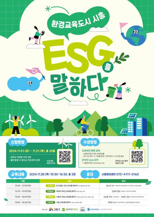 [¿¡ÄÚȯ°æÀϺ¸ ½ÃÈï½Ã=À̽ŵ¿±âÀÚ] ȯ°æ±³À°µµ½Ã ½ÃÈï½Ã´Â 11¿ù 28ÀÏ ½ÃÈï¿¡ÄÚ¼¾ÅÍ¿¡¼­ ¡®È¯°æ±³À°µµ½Ã ½ÃÈï, ESG¸¦ ¸»ÇÏ´Ù¡¯ °­ÀǸ¦ °³ÃÖÇÑ´Ù. ½Ã´Â ȯ°æºÎ·ÎºÎÅÍ ¡®È¯°æ±³À°µµ½Ã¡¯·Î ÁöÁ¤µÅ 2024³âºÎÅÍ 2026³â±îÁö 3³â°£, ȯ°æ±³À° Àü¹® Àη ¾ç¼º, Áö¿ªÈ¯°æ Çб³¡¦