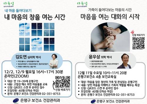 [¿¡ÄÚȯ°æÀϺ¸ ÀºÆò±¸=À̽ŵ¿±âÀÚ] ÀºÆò±¸´Â ±¸¹ÎÀÇ ¸¶À½ °Ç°­À» À§ÇÑ ¼ÒÅë ÇÁ·Î±×·¥À¸·Î ¡®³» ¸¶À½ÀÇ Ã¢À» ¿©´Â ½Ã°£¡¯°ú ¡®¸¶À½À» ¿©´Â ´ëÈ­ÀÇ ½ÃÀÛ¡¯À» ¿î¿µÇϰí, ¼±Âø¼ø Á¢¼öÇÑ´Ù°í ¹àÇû´Ù. À̹ø ÇÁ·Î±×·¥Àº û³â°ú °¡Á· °£ÀÇ ÀÌÇØ¿Í °ø°¨À» µ½°í, ½É¸®Àû ¾î·Á¿ò¡¦