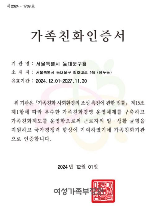 [¿¡ÄÚȯ°æÀϺ¸ µ¿´ë¹®±¸=À̽ŵ¿±âÀÚ] ¼­¿ï µ¿´ë¹®±¸°¡ 12¿ù 1ÀÏ ¿©¼º°¡Á·ºÎ ¡®°¡Á·Ä£È­±â°ü¡¯À¸·Î ÀçÀÎÁõ ¹Þ¾Ò´Ù. 2013³â °¡Á·Ä£È­±â°üÀ¸·Î ÃÖÃÊ ÀÎÁõµÈ µ¿´ë¹®±¸´Â À̹ø ÀÎÁõÀ¸·Î 2027³â 11¿ù 30ÀϱîÁö ¸í¿¹¸¦ À¯ÁöÇÏ°Ô µÆ´Ù. ¡®°¡Á·Ä£È­ÀÎÁõ¡¯À̶õ À¯¿¬±Ù¹«Á¦µµ, ¡¦