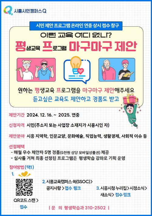 [¿¡ÄÚȯ°æÀϺ¸ ½ÃÈï½Ã=À̽ŵ¿±âÀÚ] ½ÃÈï½Ã´Â ½Ã¹ÎÀÇ ´Ù¾çÇÑ ¿ä±¸¸¦ ¹Ý¿µÇÑ ¸ÂÃãÇü Æò»ýÇнÀ ÇÁ·Î±×·¥À» ±âȹÇϰíÀÚ ¡®Æò»ýÇнÀ ÇÁ·Î±×·¥ ¸¶±¸¸¶±¸ Á¦¾È¡¯ ¿Â¶óÀÎ »ó½Ã Á¢¼ö ⱸ¸¦ ¿î¿µÇϸç, À̸¦ ÅëÇØ ¼±Á¤µÈ ½Ã¹Î Á¦¾È ÇÁ·Î±×·¥À» 2025³â ¿¬Áß ¿î¿µÇÒ °èȹÀÌ´Ù. ¡®¡¦