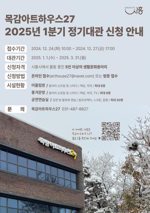 [¿¡ÄÚȯ°æÀϺ¸ ½ÃÈï½Ã=À̽ŵ¿±âÀÚ] ½ÃÈï½Ã´Â 12¿ù 24ÀÏ ¿ÀÀü 10½ÃºÎÅÍ 27ÀÏ ¿ÀÈÄ 5½Ã±îÁö ¸ñ°¨¾ÆÆ®ÇϿ콺27¿¡¼­ ½ÃÈï½Ã¿¡¼­ Ȱµ¿ ÁßÀÎ »ýȰ¹®È­µ¿¾Æ¸®¸¦ ´ë»óÀ¸·Î ¡®2025³â 1ºÐ±â Á¤±â´ë°ü¡¯ ½ÅûÀ» ¹Þ´Â´Ù. ´ë°ü °¡´É °ø°£Àº µ¿¾Æ¸® ¼Ò¸ðÀÓ ¹× ½ºÅ͵ð¿ëÀ¸·Î »ç¿ëÇÒ¡¦