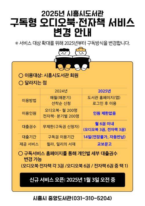 [¿¡ÄÚȯ°æÀϺ¸ ½ÃÈï½Ã=À̽ŵ¿±âÀÚ] ½ÃÈï½Ãµµ¼­°üÀº 2025³â 1¿ù 3ÀϺÎÅÍ ±¸µ¶Çü ¿Àµð¿ÀºÏ ¹× ÀüÀÚÃ¥ ¼­ºñ½º¸¦ È®´ë ¿î¿µÇÑ´Ù. À̹ø ±¸µ¶Çü ¼­ºñ½º È®´ë¸¦ ÅëÇØ ½Ã¹ÎµéÀº ½Å°£ ¹× º£½ºÆ®¼¿·¯ µµ¼­¸¦ ¿¹¾à ¾øÀÌ ÀÌ¿ëÇÒ ¼ö ÀÖÀ¸¸ç, ¾ðÁ¦ ¾îµð¼­³ª Æí¸®ÇÏ°Ô ÀÌ¿ëÇÒ ¼ö ÀÖ°Ô ¡¦