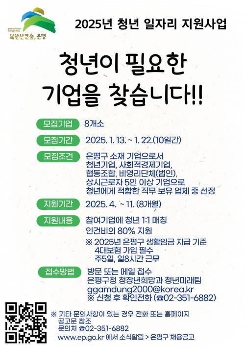 [¿¡ÄÚȯ°æÀϺ¸ ÀºÆò±¸=À̽ŵ¿±âÀÚ] ÀºÆò±¸´Â û³â ±¸Á÷³­ ÇØ¼Ò¸¦ À§ÇØ ¡®2025³â û³â ÀÏÀÚ¸®»ç¾÷¡¯¿¡ Âü¿©ÇÒ ±â¾÷ ¶Ç´Â ´Üü¸¦ ¸ðÁýÇÑ´Ù°í ¹àÇû´Ù. û³â ÀÏÀÚ¸®»ç¾÷Àº û³â¿¡°Ô ÀûÇÕÇÑ Áö¿ª ÀÏÀÚ¸®¸¦ ¹ß±¼Çϰí Á¦°øÇØ Ã»³âµéÀÇ °æÁ¦È°µ¿°ú Á÷¹«¿ª·® °­È­¸¦ Áö¿øÇϴ¡¦