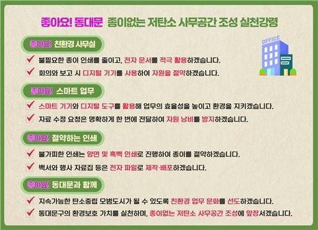 [¿¡ÄÚȯ°æÀϺ¸ µ¿´ë¹®±¸=À̽ŵ¿±âÀÚ] µ¿´ë¹®±¸°¡ ¡®Á¾ÀÌ ¾ø´Â Àúź¼Ò »ç¹«½Ç¡¯ Á¶¼ºÀ» º»°Ý ÃßÁøÇÑ´Ù. À̹ø Á¤Ã¥Àº Á¾ÀÌ Áß½ÉÀÇ ÇàÁ¤¿¡¼­ ¹þ¾î³ª ½º¸¶Æ® ±Ù¹«È¯°æÀ» Àû±Ø µµÀÔÇØ ¾÷¹« È¿À²À» ³ôÀ̰í, ÀÚ¿ø Àý¾à°ú ź¼ÒÁ߸³ ½Çõ ¹®È­¸¦ È®»êÇϱâ À§ÇØ ¸¶·ÃµÆ´Ù. ±¸´Â¡¦