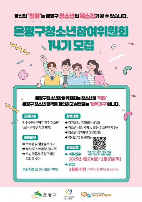 [¿¡ÄÚȯ°æÀϺ¸ ÀºÆò±¸=À̽ŵ¿±âÀÚ] ÀºÆò±¸´Â ³»´Þ 6ÀϱîÁö û¼Ò³âÀÇ ±ÇÀÍÁõÁø ¹× û¼Ò³â »ç¾÷¡¤Á¤Ã¥ Âü¿© Ȱ¼ºÈ­¸¦ À§ÇØ ¡®Á¦14±â ÀºÆò±¸ û¼Ò³âÂü¿©À§¿øÈ¸¡¯ À§¿ø°ú û³â ¸àÅ並 ¸ðÁýÇÑ´Ù°í ¹àÇû´Ù. ¡®Á¦14±â ÀºÆò±¸ û¼Ò³âÀ§¿øÈ¸¡¯ À§¿øÀº Çб³Ãßõ°ú °ø°³¸ðÁýÀ» Å롦