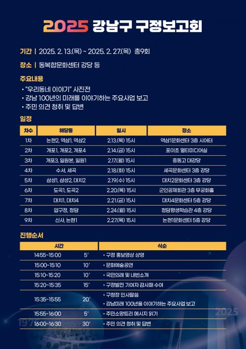 [¿¡ÄÚȯ°æÀϺ¸ °­³²±¸=À̽ŵ¿±âÀÚ] ²ÞÀÌ ¸ðÀÌ´Â µµ½Ã, ¹Ì·¡¸¦ ±×¸®´Â °­³²±¸°¡ 2¿ù 13ÀϺÎÅÍ 27ÀϱîÁö ¡®2025 °­³²±¸ ±¸Á¤º¸°íȸ¡¯¸¦ °³ÃÖÇÑ´Ù. ±¸Ã»ÀåÀÌ ÁÖ¹ÎÀ» Á÷Á¢ ¸¸³ª ¡®°­³²ÀÇ ¹Ì·¡ 100³âÀ» ÁغñÇÏ´Â Çõ½ÅÁ¤Ã¥¡¯À» ¹ßÇ¥ÇÏ°í ¼ÒÅëÇÏ´Â ½Ã°£À» °®´Â´Ù. À̹ø º¸°í¡¦