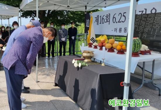 (¿¡ÄÚȯ°æÀϺ¸=±èÀçÂù±âÀÚ) ±¤»ê±¸ ¾î·æµ¿ ¹ßÀüÇùÀÇȸ(ȸÀå ±èöÁØ)°¡ 25ÀÏ ¼±¾Ïµ¿ Áߺ¸±³ ÀÔ±¸ ÃæÈ¥ºñ ¾Õ¿¡¼ Á¦16ȸ 6.25 ÂüÀü¿ë»ç ÃæÈ¥Á¦¸¦ Áö³Â´Ù.