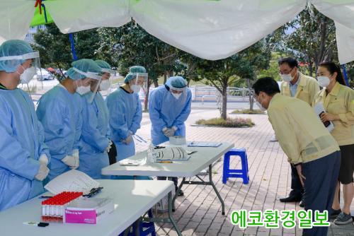 [¿¡ÄÚȯ°æÀϺ¸=±è±â³² ±âÀÚ] ±Ç¿ÀºÀ ¿©¼ö½ÃÀåÀÌ 9ÀÏ ¿ÀÈÄ Çϰè ÈÞ°¡Ã¶ ¿©¼ö½Ã¸¦ ¹æ¹®ÇÏ´Â °ü±¤°´°ú ½Ã¹ÎÀ» À§ÇØ ¿î¿µÇϰí ÀÖ´Â ¿¢½ºÆ÷¿ª Àӽà ¼±º°°Ë»ç¼Ò¸¦ ã¾Æ Á÷¿øµéÀÇ ³ë°í¸¦ °Ý·ÁÇÏ¸ç ¾Ö·Î»çÇ× Ã»Ãë¿¡ ³ª¼¹´Ù.