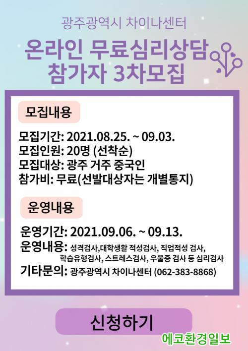 (¿¡ÄÚȯ°æÀϺ¸=±èÀçÂù±âÀÚ) ±¤ÁÖ±¤¿ª½Ã Â÷À̳ª¼¾ÅÍ(¼¾ÅÍÀå Á¶°æ¿Ï È£³²´ë ±³¼ö)°¡ 8¿ù 25ÀϺÎÅÍ 9¿ù3ÀϱîÁö ±¤ÁÖ¿¡ °ÅÁÖÇÏ´Â Áß±¹ÀÎÀ» ´ë»óÀ¸·Î ¹«·á ¿Â¶óÀÎ ½É¸®°Ë»ç 3Â÷ Âü°¡ÀÚ¸¦ ¸ðÁýÇÑ´Ù.