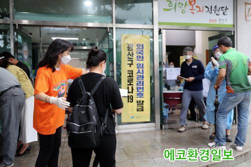 (¿¡ÄÚȯ°æÀϺ¸=±èÀçÂù±âÀÚ) ±¤ÁÖ ±¤»ê±¸(±¸Ã»Àå ±è»ïÈ£) ¿Ü±¹ÀÎÁֹΠÀç´É±âºÎ´ÜÀÌ ¹æ¿ªÇöÀå °÷°÷À» ´©ºñ¸ç Äڷγª19 È®»ê Â÷´Ü¿¡ Å« ÈûÀ» º¸Å°í ÀÖ´Ù.