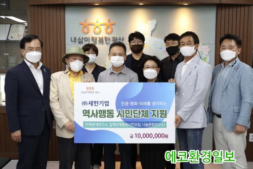 [¿¡ÄÚȯ°æÀϺ¸=À̺´±¸±âÀÚ] ¢ß¼¼Çѱâ¾÷ÀÌ 15ÀÏ ±¤»ê±¸Ã»¿¡¼­ Àü´Þ½ÄÀ» °®°í ¿ª»ç Á¤ÀÇ¿Í ÀαÇ‧ÆòÈ­ °¡Ä¡ ½ÇÇöÀ» À§ÇØ ³ë·ÂÇϰí ÀÖ´Â ¹ÎÁ·¹®Á¦¿¬±¸¼Ò ±¤ÁÖÀü³²ÁöºÎ, ÀÏÁ¦°­Á¦µ¿¿ø ½Ã¹Î¸ðÀÓ, ³ª´®¹®È­¿¬±¸¼Ò µî ½Ã¹Î´Üü 3°÷¿¡ ÃÑ 1000¸¸ ¿øÀ» ÈÄ¿øÇß´Ù.