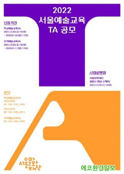 [¿¡ÄÚȯ°æÀϺ¸´º½º=Á¤ÁöÀ± ±âÀÚ] ¼¿ï¹®ÈÀç´Ü(´ëÇ¥ÀÌ»ç ÀÌâ±â)Àº ¼¿ï½Ã³» Çб³¿Í Áö¿ª °ÅÁ¡ Ű¿ò¼¾ÅÍ µî¿¡¼ ¿¹¼ú ¼ö¾÷À» ÁøÇàÇÒ ±³À°¿¹¼ú°¡(Teaching Artist, TA)¿Í ±³À°´Üü¸¦ ¼±¹ßÇÏ´Â 2022³â ¼¿ï¿¹¼ú±³À°»ç¾÷ °ø¸ð¸¦ 27ÀÏ(¿ù)ºÎÅÍ ³»³â 2¿ù 16ÀÏ(¼ö)±îÁö ÁøÇàÇÑ´Ù°í ¸»Çß½À´Ï´Ù.