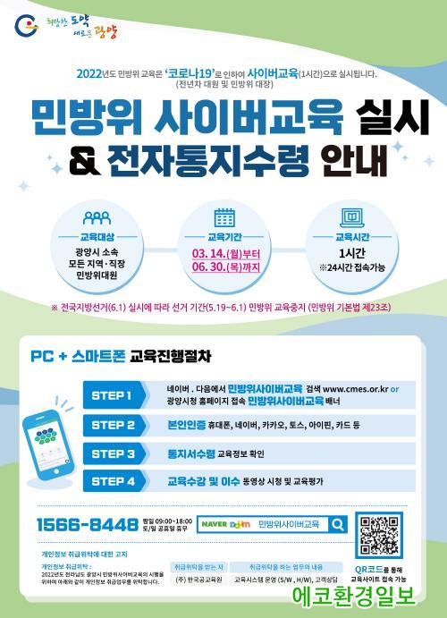 2022³â ¹Î¹æÀ§±³À°Àº ÁýÇÕ±³À° ½Ã ¹ß»ýÇÒ ¼ö ÀÖ´Â °¨¿°º´ È®»êÀ» ¹æÁöÇϱâ À§ÇÑ °ÍÀ¸·Î, ¸ðµç ¹Î¹æÀ§ ´ë¿øÀº 3¿ù 14ÀÏ~6¿ù 30ÀÏ ¹Î¹æÀ§ »çÀ̹ö±³À°(Çѱ¹°ø±³À°¿ø) ȨÆäÀÌÁö(www.cmes.or.kr)¿¡ Á¢¼ÓÇØ ¾à 1½Ã°£ °úÁ¤ÀÇ ±³À° ¿µ»óÀ» ½ÃûÇÏ°í ¹®Á¦ Ç®À̸¦ ½Ç½ÃÇÏ¸é µÈ´Ù.±³À° ³»¿ëÀº ¹Î¹æÀ§ ´ë¿øÀÇ ÀÓ¹«¿Í ¿ªÇÒ, ÇÙ ¹× È»ý¹æ ´ëÀÀ, »ýȰ¾ÈÀü¿¡ À¯¿ëÇÑ °¨¿°º´ ¿¹¹æ, ÀÎ¸í±¸Á¶, ÀÀ±Þóġ, ¼ÒÈ È°µ¿, ÁöÁø, ÁöÁøÇØÀÏ, ÅÂdz, ÇØ»ó¾ÈÀü, Æø¿°ÀÇ ´ëÀÀ¡¤¼ö½À¡¤º¹±¸ ü°è µîÀ¸·Î ±¸¼ºµÅ ÀÖ´Ù.