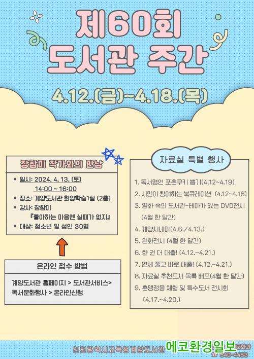 ÀåÂü¹Ì ÀÛ°¡¿ÍÀÇ ¸¸³² ÇÁ·Î±×·¥ Âü¿©ÀÚ´Â ÇöÀç °è¾çµµ¼°ü ´©¸®Áý(https://lib.ice.go.kr/gyeyang)¿¡¼ ¸ðÁý ÁßÀ̸ç, °ü·Ã ÀÚ¼¼ÇÑ »çÇ×Àº ´©¸®Áý °øÁö»çÇ×À» È®ÀÎÇϰųª µ¶¼¹®È°ú(¢Ï540-4453)À¸·Î ¹®ÀÇÇÏ¸é µÈ´Ù.