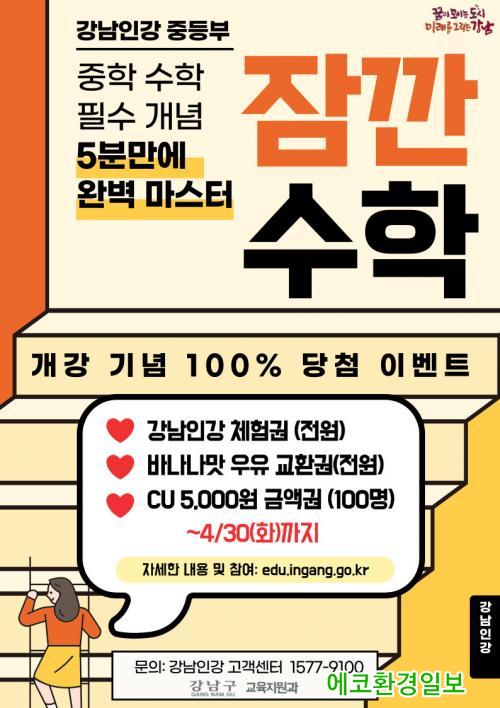 ±¸´Â Àá±ñ¼öÇÐ °³°À» ±â³äÇØ 4¿ù ¸»±îÁö °¡ÀÔ À̺¥Æ®¸¦ ÆîÄ£´Ù. °³²Àΰ ȨÆäÀÌÁö(edu.ingang.go.kr)ÀÇ À̺¥Æ® ¹è³Ê¿¡ Á¢¼ÓÇØ ¸Àº¸±â °ÀǸ¦ ½Ãû ÈÄ ´ñ±Û¿¡ ¼ö°Æò, ±â´ëÆò µîÀ» ³²±â¸é Âü°¡ÀÚ Àü¿ø¿¡°Ô °³²Àΰ Àü °Á ¹«Á¦ÇÑ ¼ö° üÇè±Ç°ú À½·á ±³È¯±ÇÀ» Á¦°øÇÑ´Ù. ¶ÇÇÑ Âü¿©ÀÚ Áß Ãß÷À» ÅëÇØ 100¸í¿¡°Ô ÆíÀÇÁ¡ »óǰ±ÇÀ» Á¦°øÇÑ´Ù.
