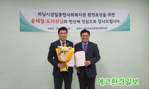 [¿¡ÄÚȯ°æÀϺ¸ Çϳ²½Ã=À̽ŵ¿±âÀÚ] »çȸº¹Áö¹ýÀÎ ÈÞ¸Õº¹Áöȸ´Â 11¿ù 29ÀÏ(±Ý), Çϳ²½Ã º¹Áöȯ°æ °³¼±¿¡ ¾ÕÀå¼­°í ÀÖ´Â °æ±âµµÀÇȸ º¸°Çº¹ÁöÀ§¿øÈ¸ À±Å±æ ÀÇ¿ø¿¡°Ô °¨»çÀåÀ» Àü´ÞÇÏ¿´´Ù.