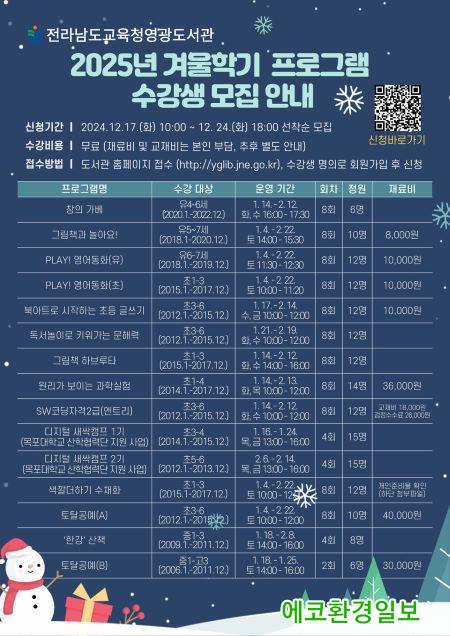 [¿¡ÄÚȯ°æÀϺ¸ Àü³²¿µ±¤=À̽ŵ¿±âÀÚ] Àü¶ó³²µµ±³À°Ã»¿µ±¤µµ¼­°üÀº 2025³â °Ü¿ïÇбâ ÇÁ·Î±×·¥À» °³¼³ÇÏ°í ¿À´Â 12¿ù 17ÀϺÎÅÍ 24ÀϱîÁö ¼ö°­»ýÀ» ¸ðÁýÇÑ´Ù.