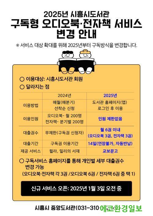 [¿¡ÄÚȯ°æÀϺ¸ ½ÃÈï½Ã=À̽ŵ¿±âÀÚ] ½ÃÈï½Ãµµ¼­°üÀº 2025³â 1¿ù 3ÀϺÎÅÍ ±¸µ¶Çü ¿Àµð¿ÀºÏ ¹× ÀüÀÚÃ¥ ¼­ºñ½º¸¦ È®´ë ¿î¿µÇÑ´Ù. À̹ø ±¸µ¶Çü ¼­ºñ½º È®´ë¸¦ ÅëÇØ ½Ã¹ÎµéÀº ½Å°£ ¹× º£½ºÆ®¼¿·¯ µµ¼­¸¦ ¿¹¾à ¾øÀÌ ÀÌ¿ëÇÒ ¼ö ÀÖÀ¸¸ç, ¾ðÁ¦ ¾îµð¼­³ª Æí¸®ÇÏ°Ô ÀÌ¿ëÇÒ ¼ö ÀÖ°Ô µÈ´Ù.
