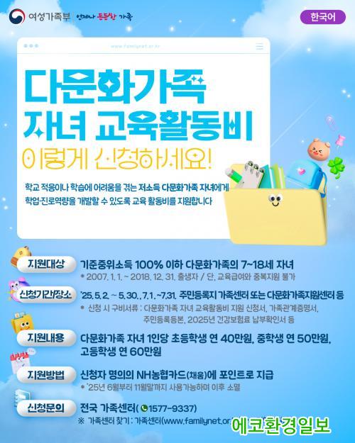 [¿¡ÄÚȯ°æÀϺ¸ ½ÃÈï½Ã=À̽ŵ¿±âÀÚ] ½ÃÈï½Ã´Â °ü³» ´Ù¹®È­°¡Á· ÀÚ³àµéÀÇ ±³À° ±âȸ È®´ë¸¦ À§ÇØ ¡®2025³â ´Ù¹®È­°¡Á· ÀÚ³à ±³À°È°µ¿ºñ Áö¿ø»ç¾÷¡¯À» ÃßÁøÇØ ÃÊ¡¤Áß¡¤°íµîÇлýÀ» ´ë»óÀ¸·Î ¿¬ 40¸¸~60¸¸ ¿ø »ó´çÀÇ ±³À°È°µ¿ºñ¸¦ Áö¿øÇÑ´Ù.
