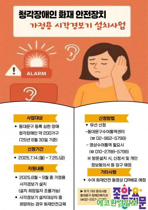 ±¸´Â û°¢Àå¾ÖÀÎÀÇ ½Åû°ú Á¢¼ö, ¼³Ä¡°¡ ¿øÈ°È÷ ÀÌ·ïÁöµµ·Ï µ¿´ë¹®±¸¼ö¾îÅ뿪¼¾ÅÍ¿Í Çù·ÂÇØ »ç¾÷À» ÁøÇàÇÑ´Ù. ¿ì¼± ½ÉÇÑ Ã»°¢Àå¾Ö°¡ ÀÖ´Â ¾à 408°¡±¸¸¦ ´ë»óÀ¸·Î ¿ìÆíÀ¸·Î »ç¾÷ ¾È³»¸¦ ¹ß¼ÛÇϰí, ¿À´Â 14ÀϺÎÅÍ 25ÀϱîÁö ¼¾ÅÍ¿¡¼ À¯¼± ¾È³»¸¦ ÅëÇØ ½Åû Àǻ縦 È®ÀÎÇÒ ¿¹Á¤ÀÌ´Ù. ÀÌÈÄ ¿ì¼±¼øÀ§ µîÀ» Á¾ÇÕÀûÀ¸·Î °í·ÁÇØ ÃÖÁ¾ÀûÀ¸·Î ¾à 200°¡±¸¸¦ ¼±Á¤Çϰí, °¡Á¤À» ¹æ¹®ÇØ ½Ã°¢°æº¸±â¸¦ ¼³Ä¡ÇÑ´Ù.