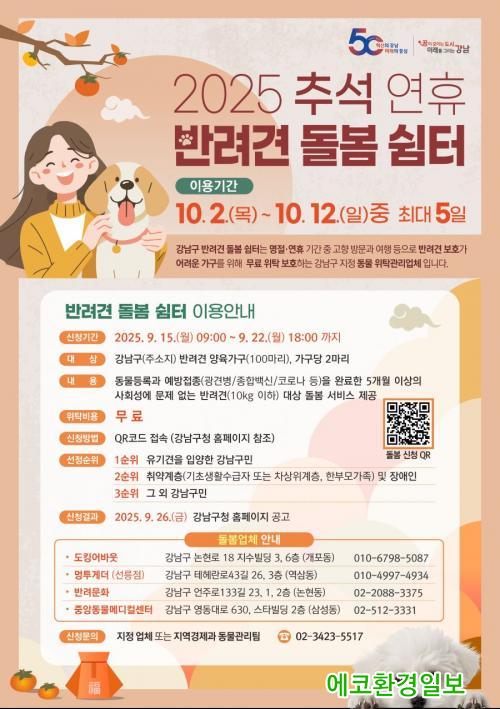 Áö¿ø ´ë»óÀº µ¿¹°µî·ÏÀ» ¸¶Ä£ 5°³¿ù·É ÀÌ»ó, üÁß 10kg ÀÌÇÏÀÇ ¹Ý·Á°ß 100¸¶¸®À̸ç, °¡±¸´ç ÃÖ´ë 2¸¶¸®±îÁö ½ÅûÇÒ ¼ö ÀÖ´Ù. ½ÅûÀº °³²±¸Ã» ȨÆäÀÌÁö ³» QRÄڵ带 ÅëÇØ °¡´ÉÇϸç, ½É»ç¸¦ °ÅÃÄ 9¿ù 26ÀÏ ´ë»óÀÚ¸¦ ¹ßÇ¥ÇÑ´Ù.