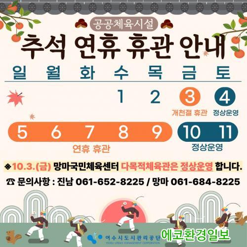´Ù¸¸, ¿¬ÈÞ Àü °³ÃµÀýÀÎ 10¿ù 3ÀÏ(±Ý)¿¡´Â ¸Á¸¶±¹¹ÎüÀ°¼¾ÅÍ ´Ù¸ñÀûüÀ°°ü¸¸ ¿î¿µÇϸç, 10¿ù 4ÀÏ(Åä)¿¡´Â Áø³²¼ö¿µÀå°ú ¸Á¸¶±¹¹ÎüÀ°¼¾ÅͰ¡ Á¤»ó ¿î¿µµÈ´Ù.