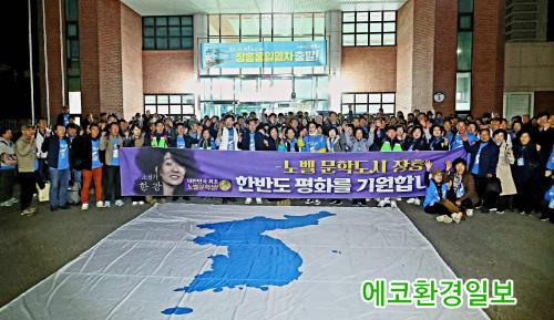 10¿ù 23ÀÏ(¸ñ) ¿ÀÈÄ2½Ã¿¡´Â °ü»êÀ¾ »ï»ê¹æÁ¶Á¦¿¡¼¡®ÅëÀÏ¿°¿ø °È±â´ëȸ¡¯°¡ ¿¸°´Ù. ±º¹Î 350¿© ¸íÀÌ ÆòÈÀÇ »ó¡±æÀ» µû¶ó °È´Â´Ù. ÇöÀå¿¡¼´Â ÅëÀÏÀ½¾Çȸµµ ÇÔ²² ¿·Á ÅëÀÏÀÇ ¸Þ½ÃÁö¸¦ ³ë·¡·Î ÀüÇÑ´Ù.