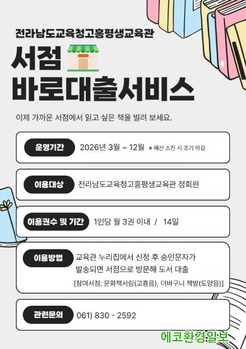 ¡®¼Á¡ ¹Ù·Î´ëÃ⼺ñ½º¡¯´Â ÀÌ¿ëÀÚ°¡ °íÈïÆò»ý±³À°°ü ´©¸®Áý¿¡¼ Èñ¸Áµµ¼¸¦ ½ÅûÇϸé Áö¿ª ¼Á¡¿¡¼ »õ Ã¥À» ¹Ù·Î ºô·Á º¼ ¼ö ÀÖ´Â ¼ºñ½ºÀÌ´Ù.