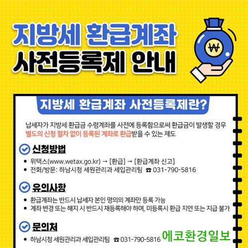 Áö¹æ¼¼ ȯ±Þ°èÁ »çÀüµî·ÏÀº À§Åýº(www.wetax.go.kr) ȨÆäÀÌÁö ¶Ç´Â ¸ð¹ÙÀÏ ¾ÛÀ» ÅëÇØ ½ÅûÇÒ ¼ö ÀÖÀ¸¸ç, Çϳ²½Ãû ¼¼¿ø°ü¸®°ú ¼¼ÀÔ°ü¸®ÆÀÀ» ¹æ¹®Çϰųª ÀüÈ(031-790-5816)·Îµµ ½ÅûÇÒ ¼ö ÀÖ´Ù. ȯ±Þ°èÁ´ ³³¼¼ÀÚ º»ÀÎ ¸íÀÇ °èÁ¸¸ µî·Ï °¡´ÉÇϸç, °èÁ º¯°æ ¶Ç´Â ÇØÁö ½Ã¿¡´Â ¹Ýµå½Ã Àçµî·ÏÇØ¾ß ÇÑ´Ù.